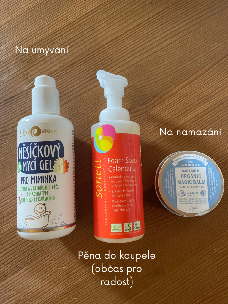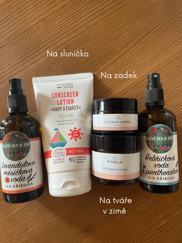 Samotná kapitola je kosmetika pro miminko. Máme pro něj jen pár základních věcí: tělové máslo, mycí olej, měsíčkový olej, zinkovou mast a několik hydrolátů. Na zimu jsem mu kupovala ještě mastičku na tváře, které měl vždy podrážděné od chladu.