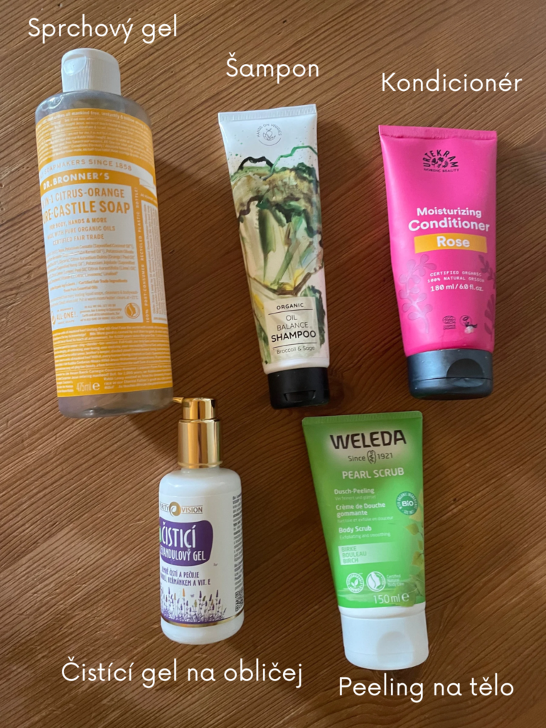Ve sprše máme také takovou základní péči: sprchový gel, šampon, kondicionér, tělový peeling, čistící gel na obličej a intimní mýdlo. Pozor taky na žiletky – některé s takovým tím gelovým proužkem obsahují ne zrovna přírodní látky.