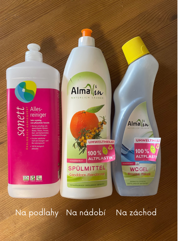 Výborný ze základních surovin je například bílý ocet, do kterého na nějakou dobu naložíme buď rozmarýn nebo třeba smrkové jehličí a potom naředíme vodou a vznikne nám takový univerzální čistič na vše (recept je podle Úklid pro klid)… Já s ním utírám stůl po jídle, používám jej na prach… Můj manžel ho pojmenoval Viktor – čistič.